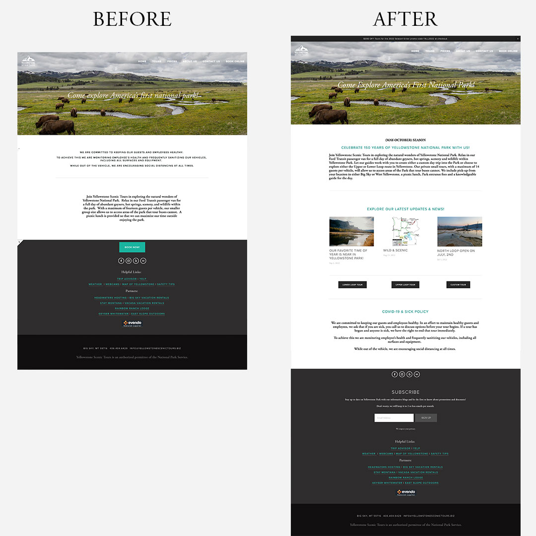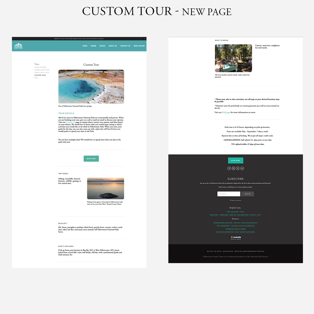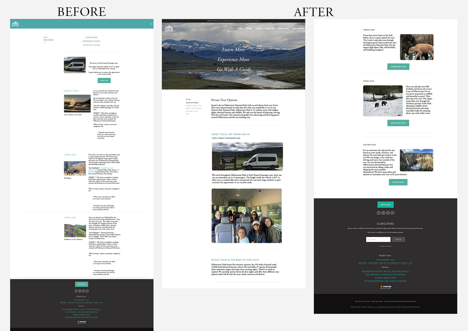 Updated the layout, content, and SEO updates for the Yellowstone Scenic Tours website created on Squarespace. Below are examples of before and after and new pages. Please visit https://www.yellowstonescenictours.biz/. Continued maintenance is performed upon request.