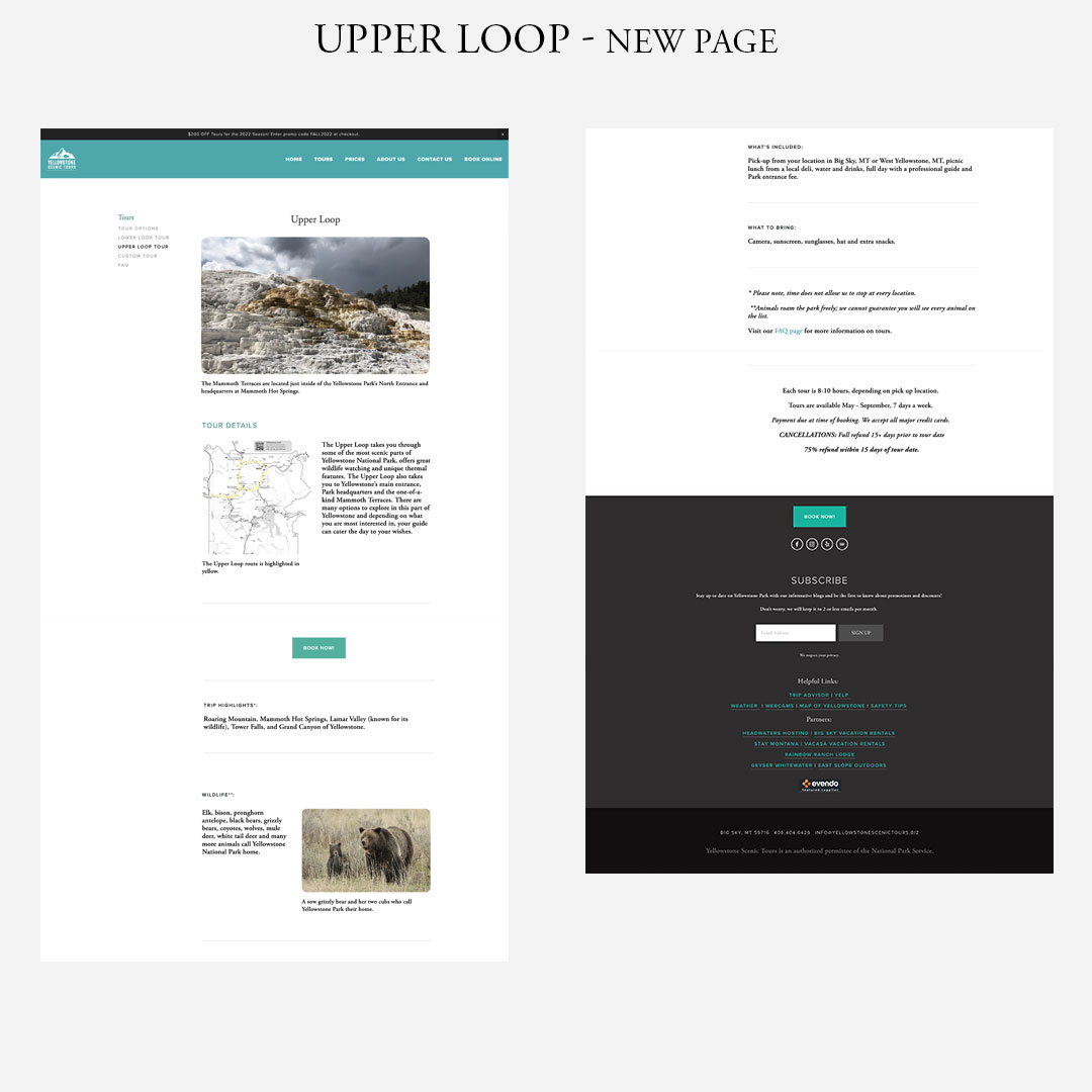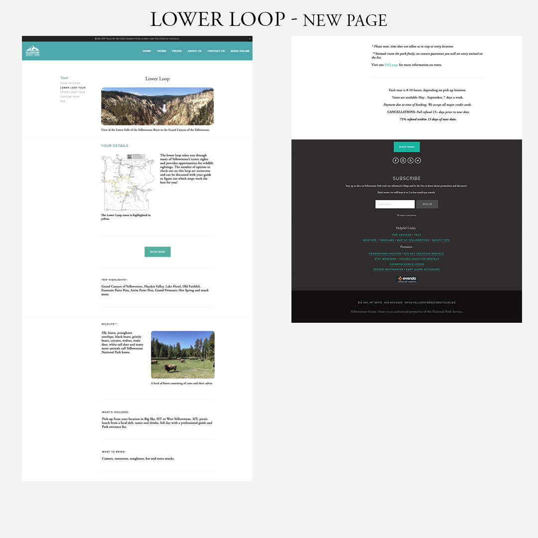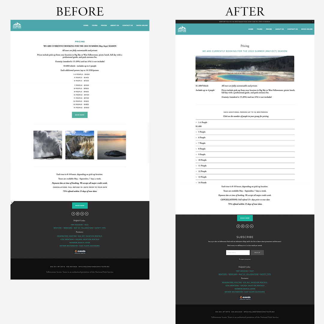 Updated the layout, content, and SEO updates for the Yellowstone Scenic Tours website created on Squarespace. Below are examples of before and after and new pages. Please visit https://www.yellowstonescenictours.biz/. Continued maintenance is performed upon request.
