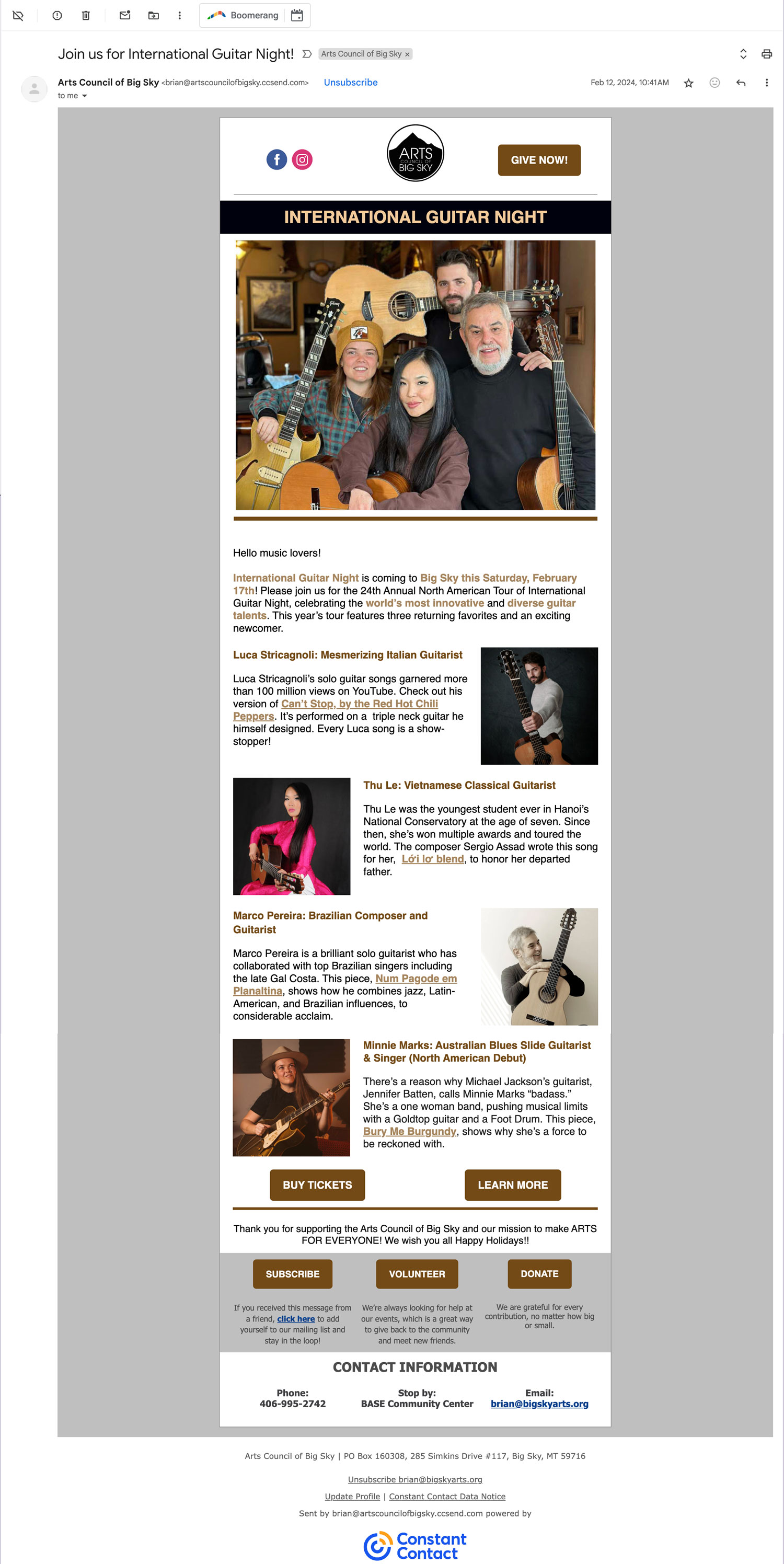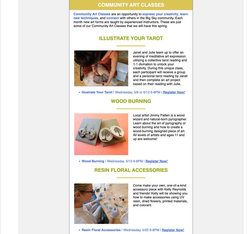 To promote specific events, I created email blasts, which were segmented into specific email lists. All email marketing emails, including the Art Beats, used similar templates to the examples below.