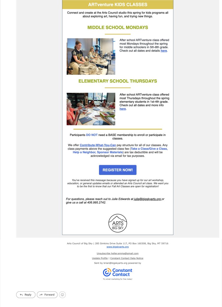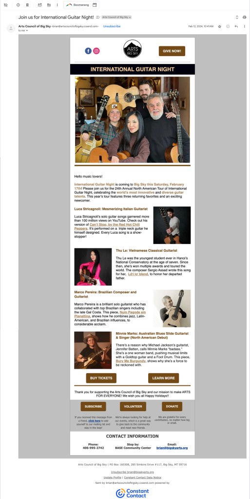 From May 2023 to June 2024, I worked as the Communications and Stewardship Coordinator at the Arts Council of Big Sky. I was responsible for creating the social media and communications calendar each month, implementing it, and creating or sourcing graphics, photos, or videos for social media posts and newsletters. I also created other graphics for the organization, which can be seen here.